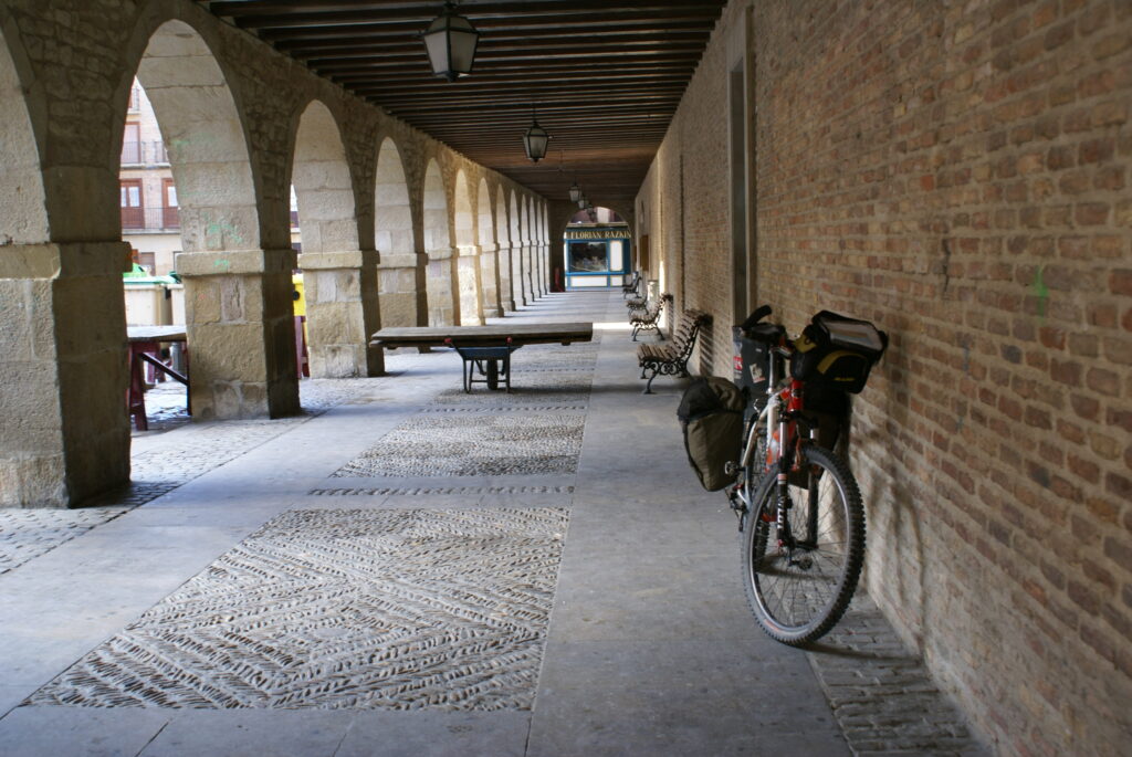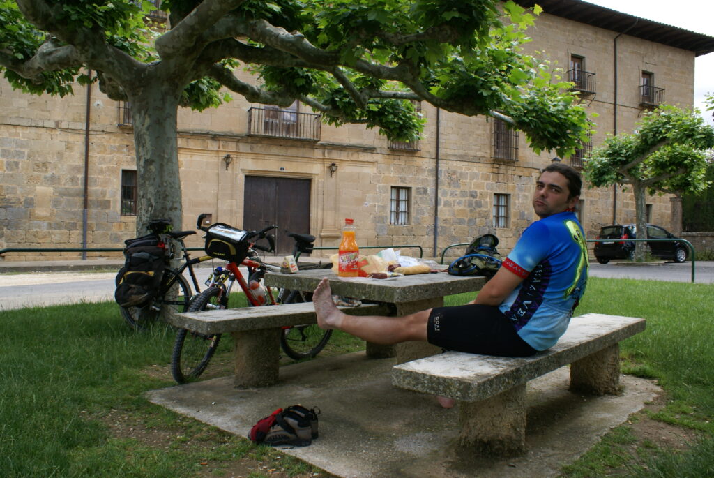 Apenas salimos de Puente la Reina seguimos las indicaciones del camino y nos metimos como pardillos por una ruta alternativa que podría ser la envidia de cualquier parque de atracciones. Subidas, bajadas, toboganes… y barro, mucho barro. La bici atascada con los frenos y la horquilla… una hora más perdida (*) Llegamos a Estella buscando la tienda de bicis, compramos algo de comer y limpiamos las bicis… y nosotros.