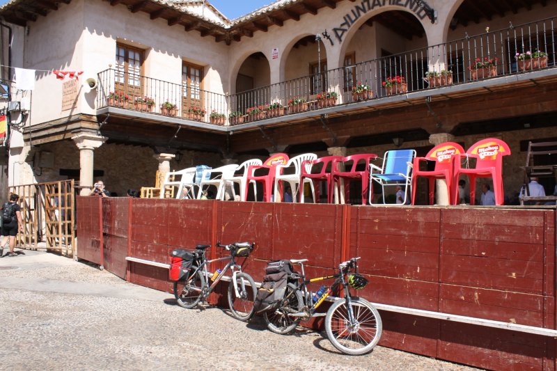 Cruzamos el Viaducto y seguimos hacia Durón, dentro de un par de horas volveremos a cruzar el viaducto de vuelta, porque haremos un bucle para ver Durón, Budia y El Olivar. En Budia están en plenas fiestas. En el pueblo están convirtiendo la plaza en un coso taurino, y una excavadora aplana el albero que han dejado en medio de la plaza en un montón donde juegan los niños desde por la mañana. Están preparando un arroz gigante para todo el pueblo, pero son las 13:00 y nos dicen que el arroz no estará hasta las 14:30. Se nos hace muy tarde para esperar, y la verdad es que nos apetece, y aunque algunos Budieros… y Budieras nos insisten nos fuimos a comer algo para salir en dirección a Sacedón antes de aperrearnos demasiado. Nos queda todavía la subida a El Olivar, que es dura, y la bajada aún más dura, muy técnica, con mucho pincho y ramas que nos dejan las piernas como mapas. Paco pinchó en la bajada.