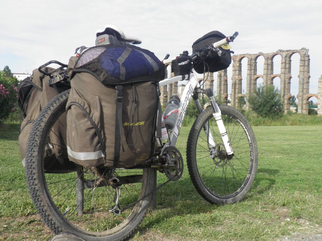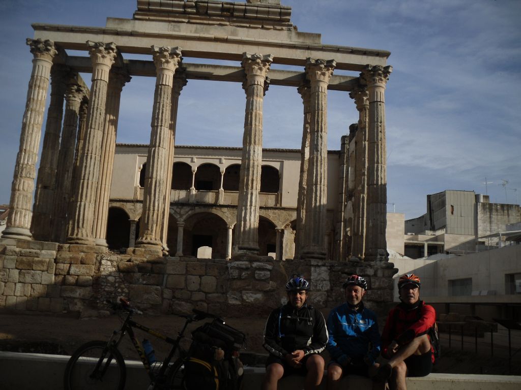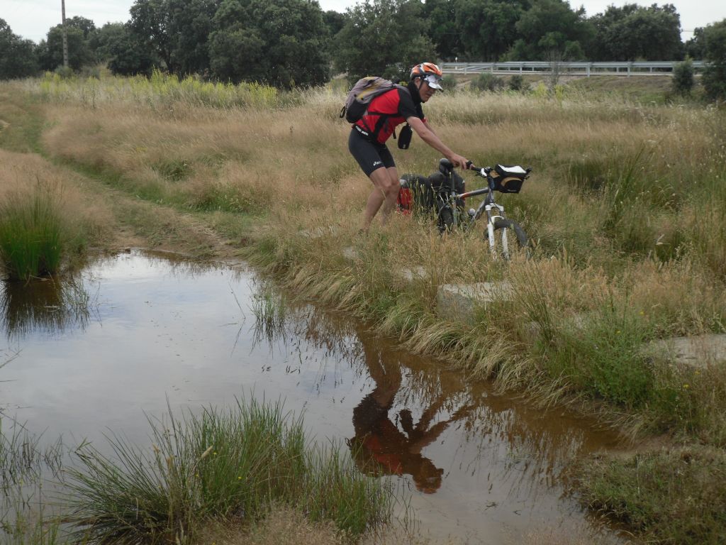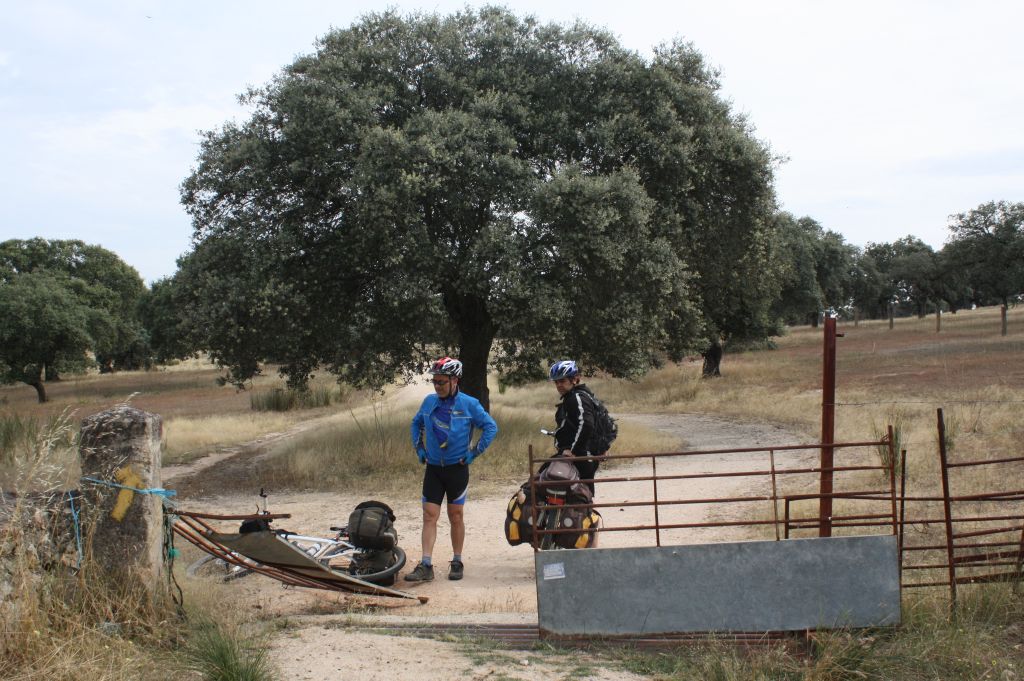 Hoy el día se presenta largo y hay que levantarse pronto. Tenemos muchos kilómetros por delante hasta Cáceres, donde pretendemos dormir. El terreno es propicio para una kilometrada, pero aún así son 100 kilómetros. Antes de las 8 ya estamos pedaleando, lo que es un logro viniendo de nosotros. Desayunamos en el mismo albergue y tomamos la carretera que sale en dirección a Mérida, atravesamos el parque del embalse de Proserpina y vamos alternando camino y carretera. Después del embalse entramos en dehesas y campos de Badajoz hasta Aljucén donde paramos como siempre a mediodía a echar gasolina a los tanques. A la hora de comer todavía estamos sin hambre y pasamos de largo Alcuéscar. Vamos bien, llevamos casi 70 kilómetros, y nos quedan 30 para Cáceres. A partir de aquí pista buena, aunque en ocasiones muy rota por las bajadas de agua de todo el invierno, muchos baches y algunos charcos, que a veces nos hacen tener que bajarnos de la bici. A la salida de Alcuéscar Paco tiene una cuenta pendiente con un antiguo puente romano que lo derribó en 2004, nunca sabremos si por culpa de las piedras o por culpa del licor de bellota del almuerzo. Dos intentos sobre el puente, con el que no pudo… lo dejamos para otro año. Eso sí, esta vez el caballero no fue derribado. Las malas sensaciones del primer día se han disipado hoy, después de 95 kilómetros los tres llegamos como si acabásemos de salir, haciendo carreritas y picándonos los unos a los otros. Un mano a mano, o mejor, un mano a mano a mano que nos llevó hasta Cáceres, con 100 kilómetros, cansados, pero contentos de haber llegado mejor de lo que pensábamos. Lo peor del día el albergue, caro para ser albergue, lejos del centro y sin ambiente de peregrinos. Nos dejamos en la entrada de Cáceres el albergue turístico porque buscábamos el que conocimos en 2004, pero ese ya no existía y al final terminamos en el albergue municipal. Rematamos el día cumpliendo en Cáceres uno de los antojos de Paco: unas migas extremeñas.