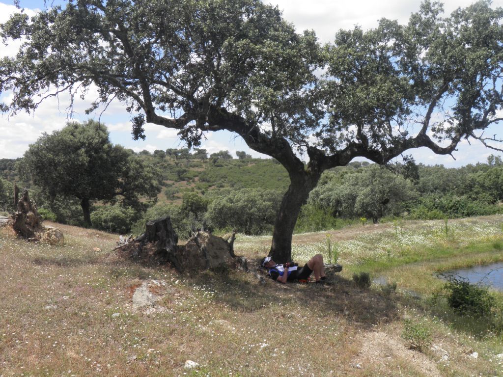 A las dos y media volvemos a subirnos en las bicis, con mucha tranquilidad y parsimonia. Subimos el Puerto de los Castaños por carretera, y en cuanto volvimos a coger camino buscamos una sombrita bajo un árbol y nos echamos una siesta de pijama y orinal.