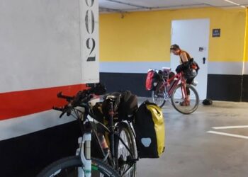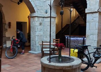 Mientras bajamos las alforjas hacemos tiempo para que la señora del hostal venga a abrirnos la puerta del garaje donde han dormido hoy las bicis. Esta noche hemos tenido serenata canina, no sé si por la lluvia intensa que ha caído esta noche o algún trueno que pudiese sonar. A…